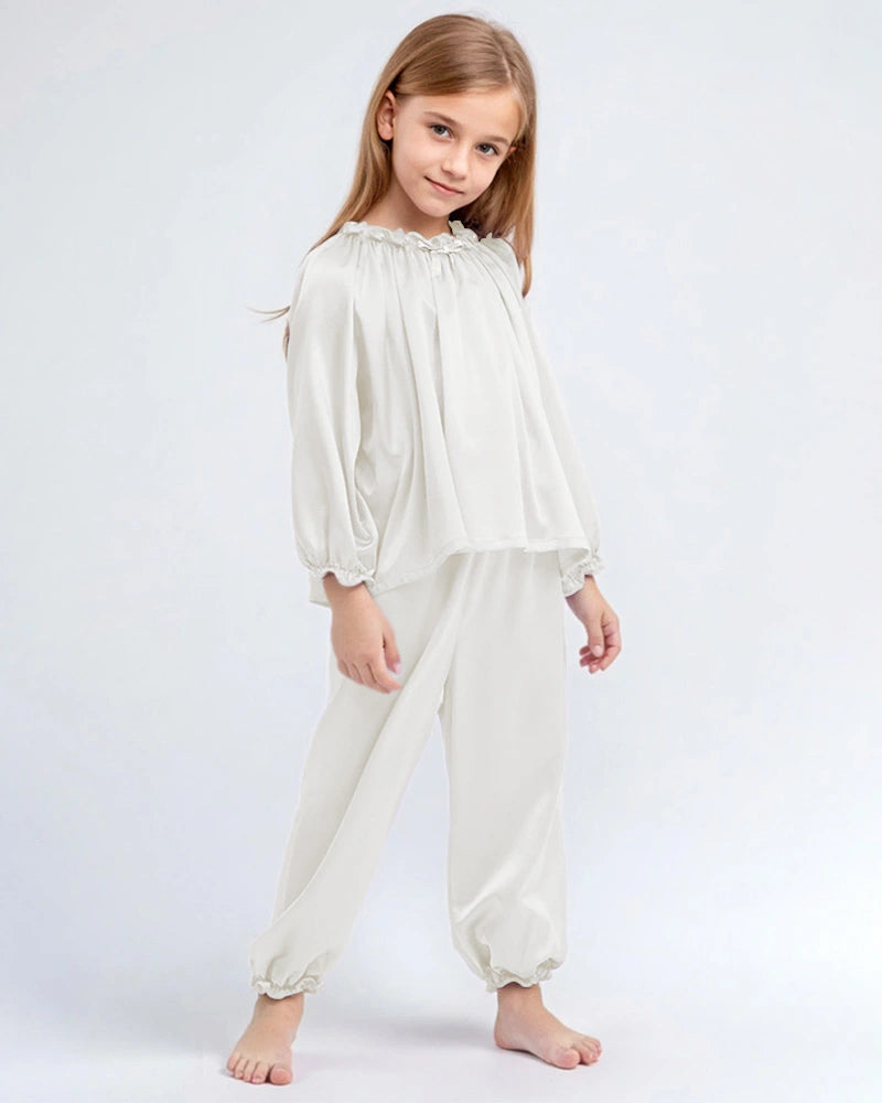 Dieses Seidenpyjama-Set für Mädchen besteht aus einem langärmeligen Oberteil und einer passenden langen Hose und wurde für Komfort, Weichheit und den täglichen Gebrauch entworfen. Gefertigt aus glatter Maulbeerseide fühlt sich der Stoff besonders sanft auf empfindlicher Haut an und bietet zugleich natürliche Atmungsaktivität sowie eine ausgeglichene Temperaturregulierung.