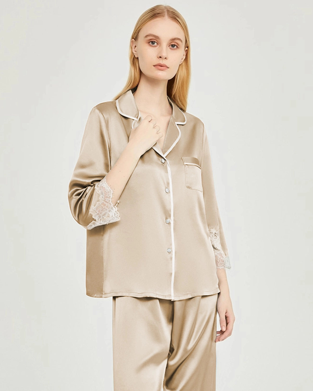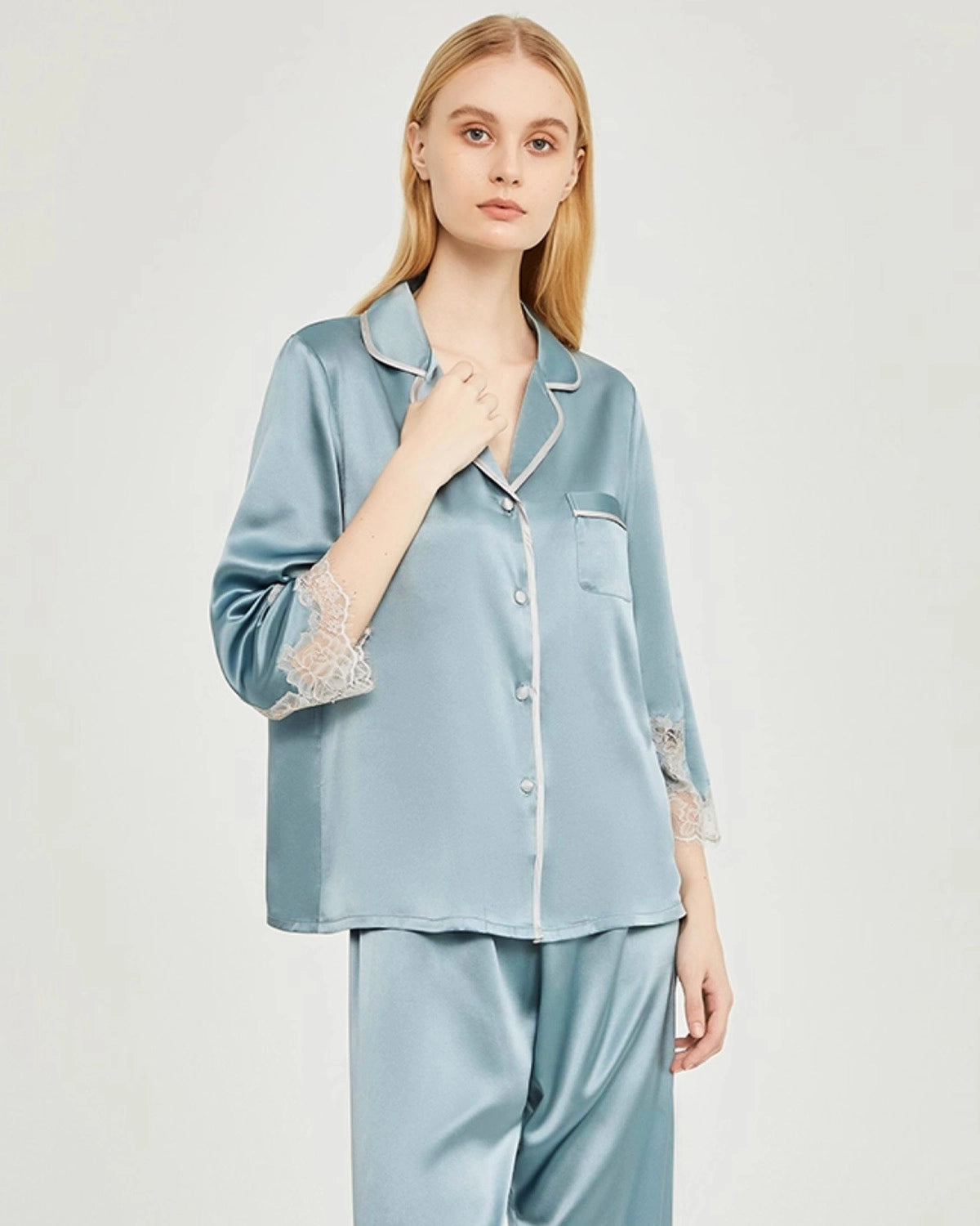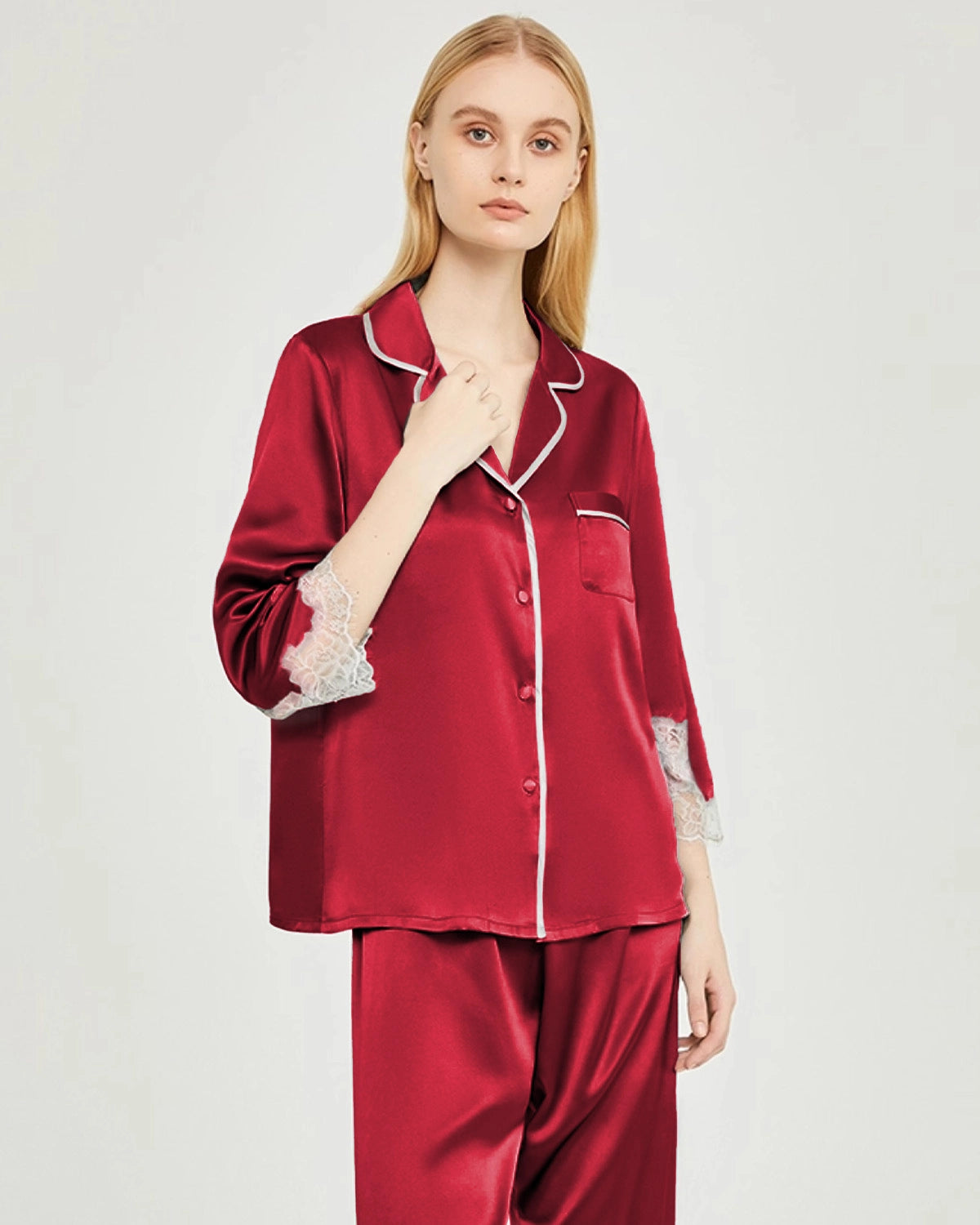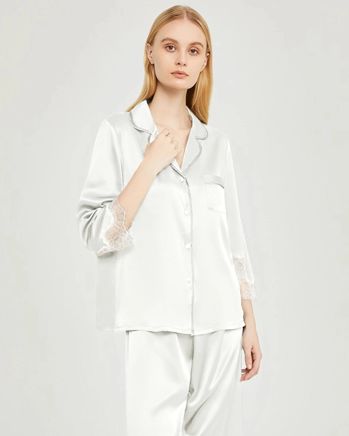 Dieses Damen-Seidenpyjama-Set mit Spitzenbesatz besticht durch elegante, mittellange Ärmel und lange Hosen, die an Ärmel- und Beinabschlüssen mit zarter Spitze verziert sind. Die feinen Details betonen den femininen Charme und verbinden moderne Eleganz mit klassischer Brautästhetik – perfekt für den Morgen der Hochzeit, Brautjungfern oder entspannte Flitterwochen.