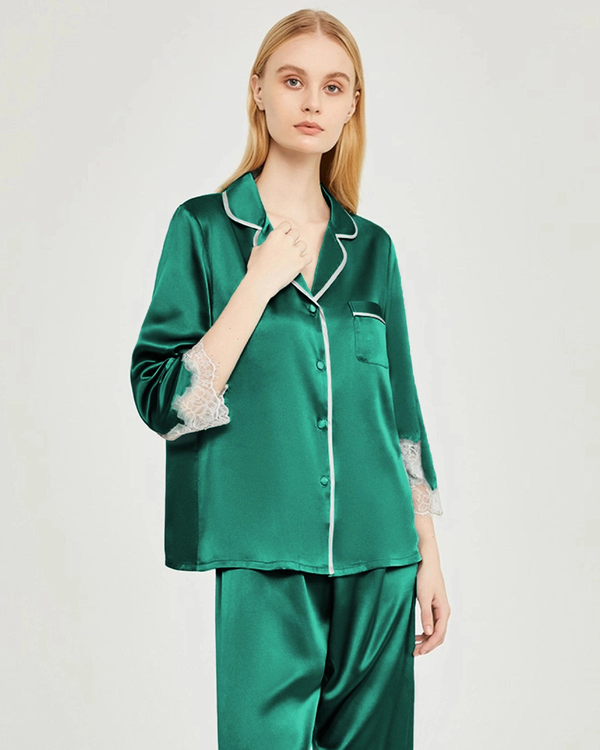 Unsere Seidenpyjamas umfasst hochwertige, waschbare Seidenpyjamas, Seidennachthemden, Seidenroben, passende Pyjama-Sets sowie unsere exklusiven luxuriösen Braut-Seidenroben und Brautpyjama-Serien. Jedes Stück ist mit dem OEKO-TEX® MADE IN GREEN-Zertifikat ausgezeichnet, was bedeutet, dass es in umweltfreundlichen und sozial verantwortlichen Betrieben ohne den Einsatz schädlicher Chemikalien hergestellt wurde. Entscheiden Sie sich für 100 % reine Maulbeerseide für unvergleichlichen Komfort, Hautpflege und Eleganz – von alltäglichen Momenten bis zu Ihren besonderen Nächten. Schlafen Sie jede Nacht wunderschön.